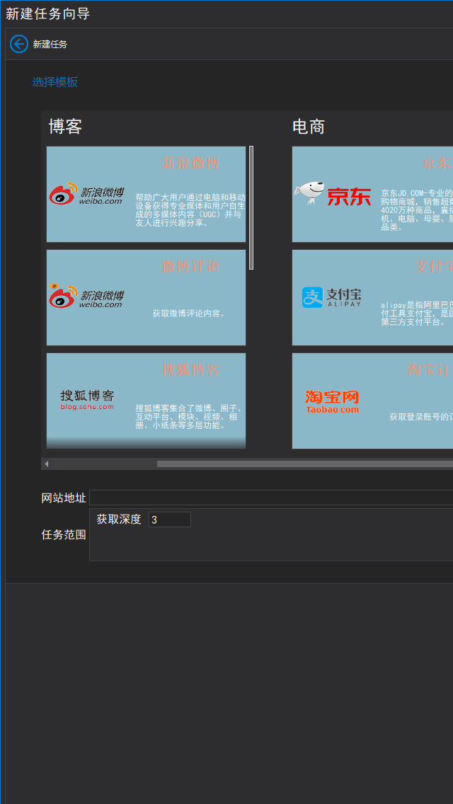 According to different target sites, select the relevant task template, can be personalized selection parameters.
